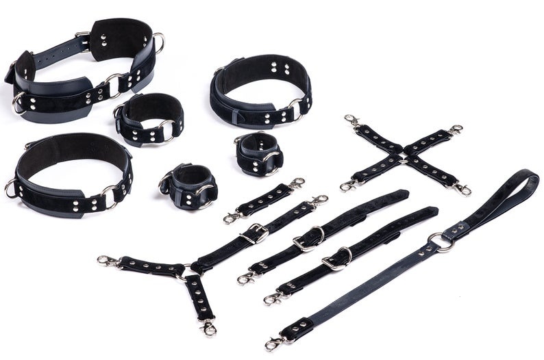 Κατασκευαζεται στην Ελλαδα, χειροποιητο, απο οργανικο δερμα και υλικά αριστης ποιότητος και αντοχης. Αποτελειται απο Περιλαιμο, ζωνη φαρδια μέσης, χειροπέδες, δέστρες μοιρων και πολλα ενσωματομενα λουρια με κρικους και γαντζους που μπορουν να σας δωσουν πολλαπλες επιλογες σε παρα πολλα διαφορετικα δεσιματα. Ενα πληρες και εντυπωσιακο σετ, φινετσατο, αποτελεσματικο που τα περιεχει ολα. Μπορειτε να το παραγγειλετε και σε ΓΝΗΣΙΟ δερμα. Τιμη: 160,00