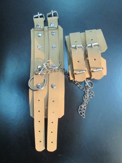 Κατασκευαζεται στην Ελλαδα, χειροποιητο, απο πλαστικο δερμα και υλικα, αριστης ποιοτητος και αντοχης. Χειροπέδες ανεξαρτητες και αποσπώμενες, χρωματος μπέζ-καφέ, με διπλο δερμα, φαρδους 7cm και διπλα ρυθμιζωμενα λουρια με τοκες, μηκους 32cm, για καλυτερο και πιο γεμάτο πιάσιμο στον καρπό, και στα ποδια ταυτοχρονα, οταν και αν επιθυμηται. Διαθετει και εξτρα αλυσιδα 30cm, για περισσοτερες εναλλακτικες στα δεσιματα σας. - (Μπορειτε να το παραγγειλετε και σε ΓΝΗΣΙΟ δερμα)