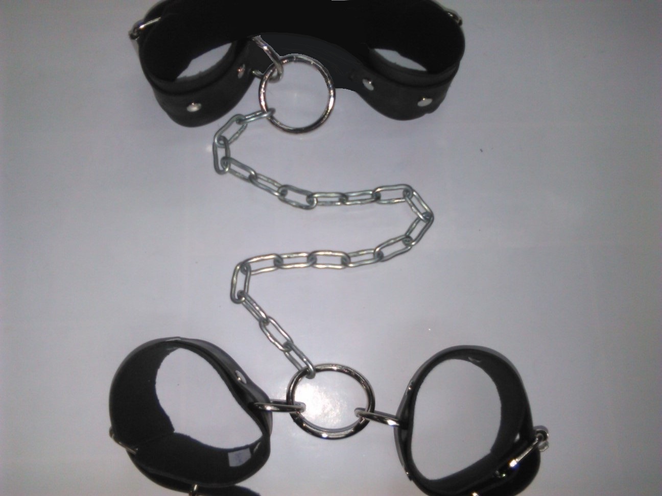 Περιγραφή Κατασκευάζετε στην Ελλάδα, χειροποίητο, απο γνήσιο ή συνθετικό δέρμα και υλιοκά άριστης ποιότητος και αντοχής. Λαιμοδέτης με διπλό δέρμα φάρδους 5,5εκ + 3εκ και χειροπέδες και αυτές με διπλό δέρμα, ενωμένες με χοντερή αλυσίδα για περισσσότερη ασφάλεια και αυστηρότητα στα ερωτικά BDSM οαιχνίδια σας.